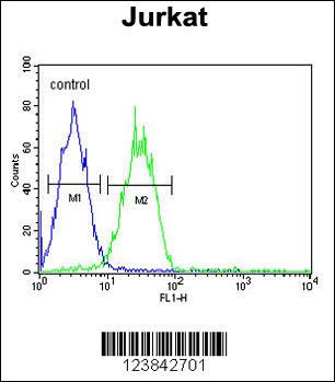 ARGLU1 Antibody (N-term) (Cat. APR06156G) flow cytometric analysis of Jurkat cells (right histogram) compared to a negative control cell (left histogram).FITC-conjugated goat-anti-rabbit secondary antibodies were used for the analysis. |