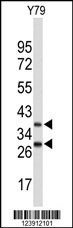 Western blot analysis of FBXO4 Antibody (Center) (Cat. APR06157G) in Y79 cell line lysates (35ug/lane). FBXO4 (arrow) was detected using the purified Pab. |