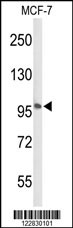 Western blot analysis of ADCY7 Antibody (Center) (Cat. APR06164G) in MCF-7 cell line lysates (35ug/lane). ADCY7 (arrow) was detected using the purified Pab.