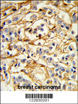Formalin-fixed and paraffin-embedded human breast carcinoma reacted with ADCY7 Antibody (Center), which was peroxidase-conjugated to the secondary antibody, followed by DAB staining. This data demonstrates the use of this antibody for immunohistochemistry; clinical relevance has not been evaluated.