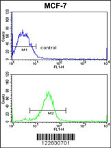 ADCY7 Antibody (Center) (Cat. APR06164G) flow cytometric analysis of MCF-7 cells (bottom histogram) compared to a negative control cell (top histogram).FITC-conjugated goat-anti-rabbit secondary antibodies were used for the analysis. |