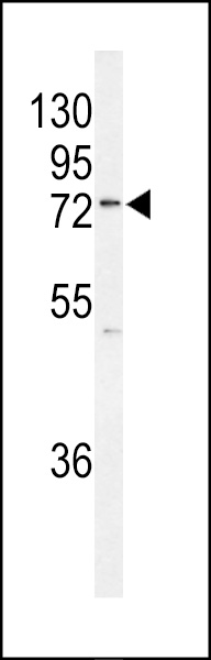Western blot analysis of K0776 Antibody (Center) (Cat. APR06183G) in MCF-7 cell line lysates (35ug/lane). K0776 (arrow) was detected using the purified Pab. |