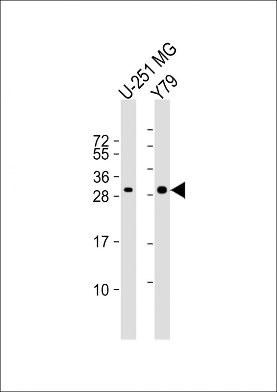 All lanes : Anti-MAPK1IP1L Antibody (Center) at 1:1000 dilution Lane 1: U-251 MG whole cell lysate Lane 2: Y79 whole cell lysate Lysates/proteins at 20 μg per lane. Secondary Goat Anti-Rabbit IgG, (H+L), Peroxidase conjugated at 1/10000 dilution. Predicted band size : 24 kDa Blocking/Dilution buffer: 5% NFDM/TBST.