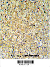 MAPK1IP1L Antibody (Center) (Cat. APR06187G) IHC analysis in formalin fixed and paraffin embedded kidney carcinoma followed by peroxidase conjugation of the secondary antibody and DAB staining. This data demonstrates the use of the MAPK1IP1L Antibody (Center) for immunohistochemistry. Clinical relevance has not been evaluated. |