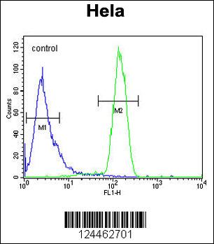 TMEM173 Antibody (C-term) (Cat. APR06189G) flow cytometric analysis of Hela cells (right histogram) compared to a negative control cell (left histogram).FITC-conjugated goat-anti-rabbit secondary antibodies were used for the analysis. |