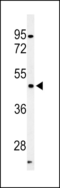 Western blot analysis of hPFTK1-M1 (Cat. APR06196G) in mouse liver tissue lysates (35ug/lane). PFTK1 (arrow) was detected using the purified Pab. |