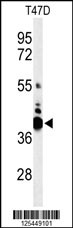 Western blot analysis of VTCN1 Antibody (Center) (Cat. APR06197G) in T47D cell line lysates (35ug/lane). VTCN1 (arrow) was detected using the purified Pab. |