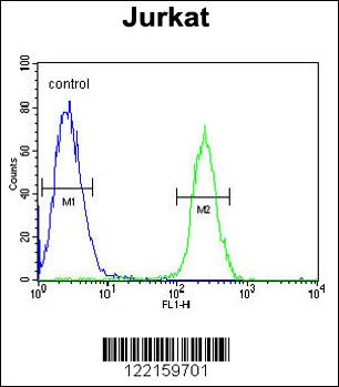 RNF8 Antibody (Cat. APR06201G) flow cytometric analysis of Jurkat cells (right histogram) compared to a negative control cell (left histogram).FITC-conjugated goat-anti-rabbit secondary antibodies were used for the analysis. |