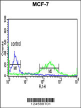 ETS2 Antibody (Center) (Cat. APR06204G) flow cytometric analysis of MCF-7 cells (right histogram) compared to a negative control cell (left histogram).FITC-conjugated goat-anti-rabbit secondary antibodies were used for the analysis. |
