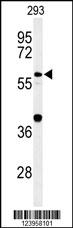 Western blot analysis of CDC45L Antibody (Center) (Cat. APR06208G) in 293 cell line lysates (35ug/lane). CDC45L (arrow) was detected using the purified Pab.