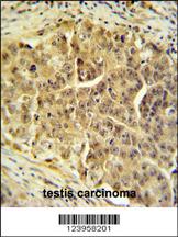 CDC45L Antibody (Center) (Cat. APR06208G) IHC analysis in formalin fixed and paraffin embedded testis tissue followed by peroxidase conjugation of the secondary antibody and DAB staining. This data demonstrates the use of the CDC45L Antibody (Center) for immunohistochemistry. Clinical relevance has not been evaluated.