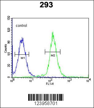 CDC45L Antibody (Center) (Cat. APR06208G) flow cytometric analysis of 293 cells (right histogram) compared to a negative control cell (left histogram).FITC-conjugated goat-anti-rabbit secondary antibodies were used for the analysis. |