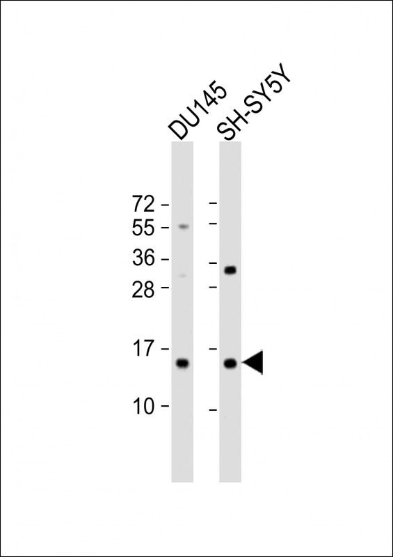 All lanes : Anti-YPEL5 Antibody (C-term) at 1:1000 dilution Lane 1: DU145 whole cell lysate Lane 2: SH-SY5Y whole cell lysate Lysates/proteins at 20 μg per lane. Secondary Goat Anti-Rabbit IgG, (H+L), Peroxidase conjugated at 1/10000 dilution. Predicted band size : 14 kDa Blocking/Dilution buffer: 5% NFDM/TBST.