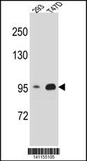 CTNNB1 Antibody (N-term) (Cat. APR06969G) western blot analysis in 293,T47D cell line lysates (35ug/lane).This demonstrates the CTNNB1 antibody detected the CTNNB1 protein (arrow).