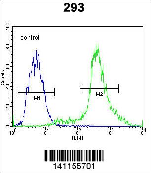 CTNNB1 Antibody (N-term) flow cytometric analysis of 293 cells (right histogram) compared to a negative control cell (left histogram).Alexa Fluor 488-conjugated donkey anti-rabbit lgG secondary antibodies were used for the analysis. |