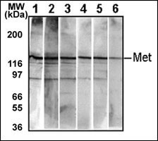 Detection of endogenous Met in HepG2 cell line. 10 μg/lane of HepG2 cell lysate was used to examine the expression of human Met. Lanes 1-5 represent Abgent's different anti-Met monoclonal antibodies. Lane 6 represents auto-phosohorylated-Met in HepG2 cell line detected by anti-phospho-Met Mab ( AM1000). |