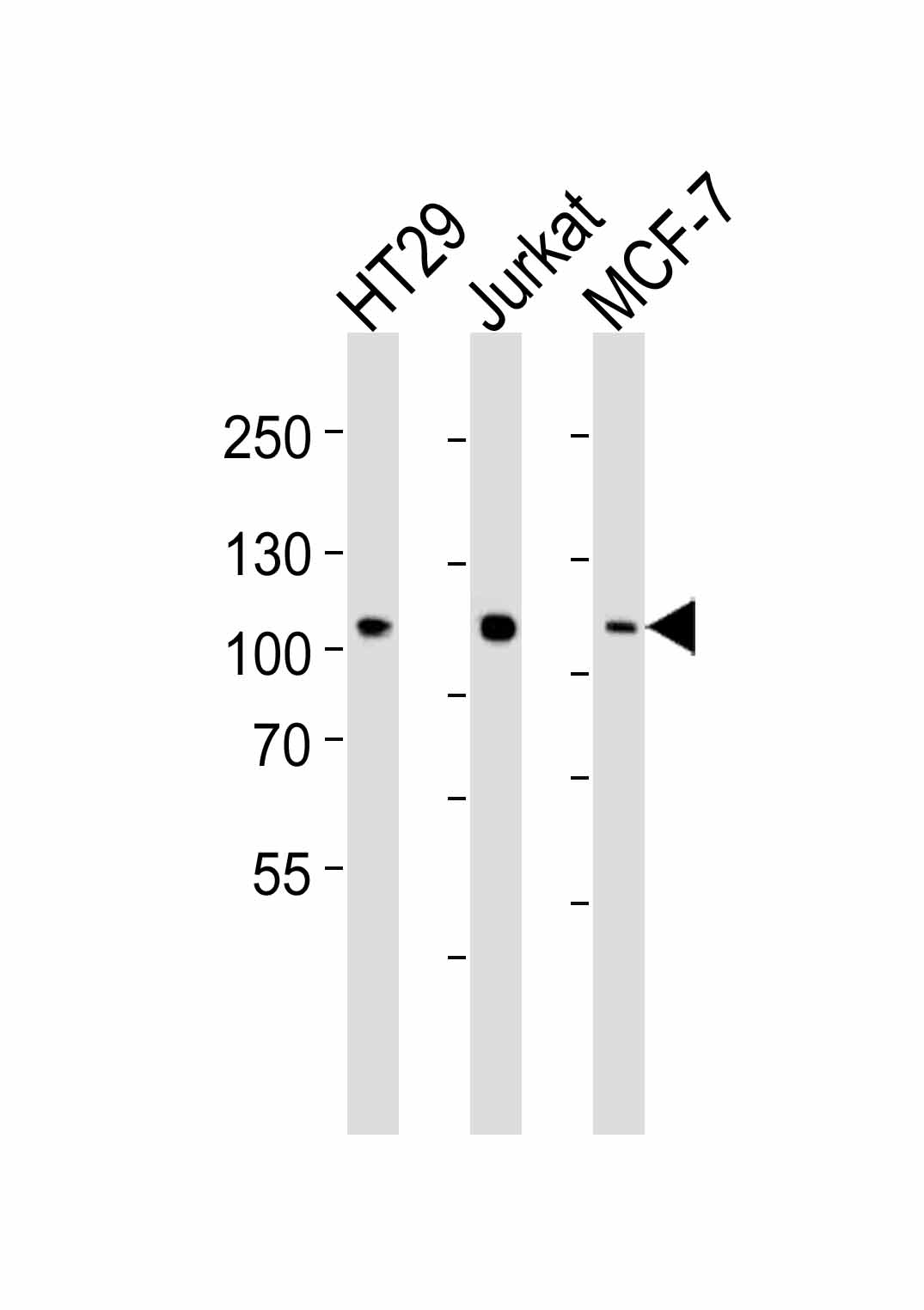 Western blot analysis of lysates from HT29, Jurkat, MCF-7 cell line (from left to right), using P100 Antibody(19AT953. 286. 93). 19AT953. 286. 93 was diluted at 1:1000 at each lane. A goat anti-mouse IgG H&L(HRP) at 1:3000 dilution was used as the secondary antibody. Lysates at 35μg per lane.