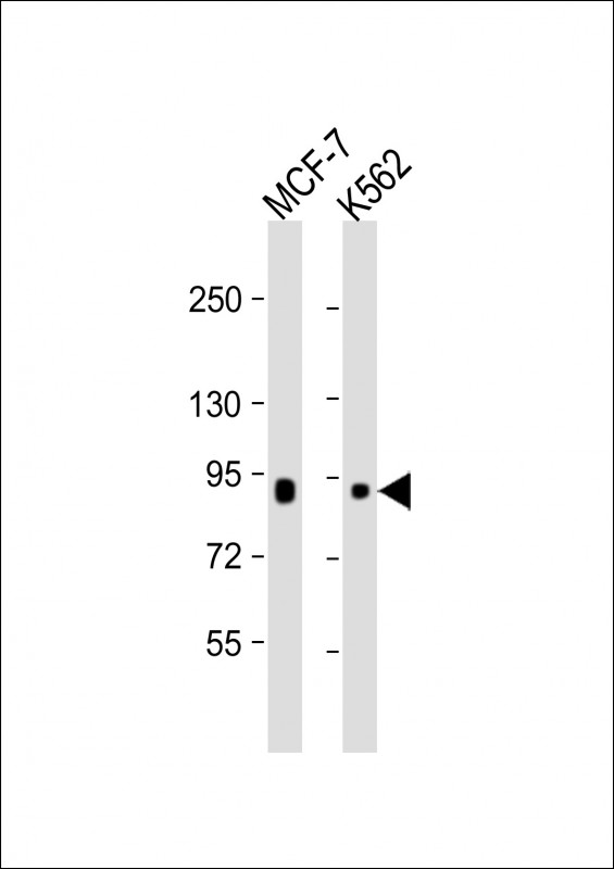 All lanes : Anti-BRAF Antibody at 1:1000 dilution Lane 1: MCF-7 whole cell lysate Lane 2: K562 whole cell lysate Lysates/proteins at 20 μg per lane. Secondary Goat Anti-mouse IgG, (H+L), Peroxidase conjugated at 1/10000 dilution. Predicted band size : 84 kDa Blocking/Dilution buffer: 5% NFDM/TBST.