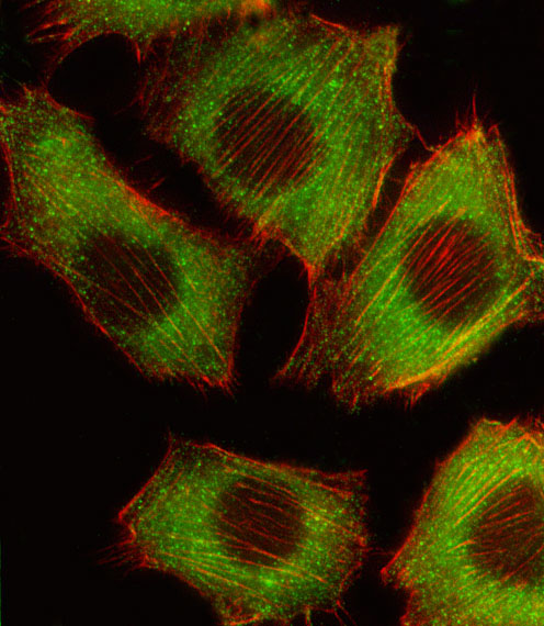 Fluorescent image of C2C12 cell stained with BRAF Antibody( AMM02330G).C2C12 cells were fixed with 4% PFA (20 min), permeabilized with Triton X-100 (0.1%, 10 min), then incubated with BRAF primary antibody (1:25, 1 h at 37℃. For secondary antibody, Alexa Fluor? 488 conjugated donkey anti-mouse antibody (green) was used (1:400, 50 min at 37℃.Cytoplasmic actin was counterstained with Alexa Fluor? 555 (red) conjugated Phalloidin (7units/ml, 1 h at 37℃.BRAF immunoreactivity is localized to Cytoplasm significantly.