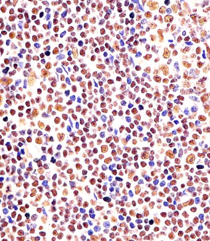 AM1836A staining EZH2 in human tonsil tissue sections by Immunohistochemistry (IHC-P - paraformaldehyde-fixed, paraffin-embedded sections). Tissue was fixed with formaldehyde and blocked with 3% BSA for 0. 5 hour at room temperature; antigen retrieval was by heat mediation with a citrate buffer (pH6). Samples were incubated with primary antibody (1/25) for 1 hours at 37°C. A undiluted biotinylated goat polyvalent antibody was used as the secondary antibody.