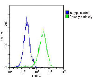 Overlay histogram showing A549 cells stained with AMM02339G(green line). The cells were fixed with 2% paraformaldehyde (10 min) and then permeabilized with 90% methanol for 10 min. The cells were then icubated in 2% bovine serum albumin to block non-specific protein-protein interactions followed by the antibody (AMM02339G, 1:25 dilution) for 60 min at 37?C. The secondary antibody used was Goat-Anti-Mouse IgG, DyLight? 488 Conjugated Highly Cross-Adsorbed(OJ192088) at 1/200 dilution for 40 min at 37?C. Isotype control antibody (blue line) was mouse IgG1 (1μg/1x10^6 cells) used under the same conditions. Acquisition of >10, 000 events was performed.