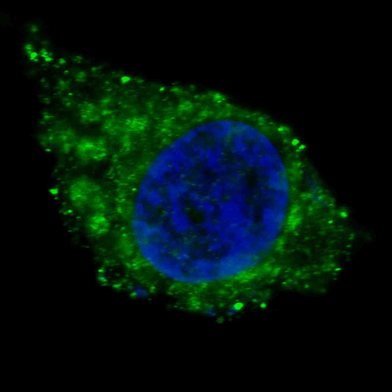 Fluorescent confocal image of HepG2 cells stained with ALDH1A1 antibody. HepG2 cells were fixed with 4% PFA (20 min), permeabilized with Triton X-100 (0.2%, 30 min). Cells were then incubated with AMM02339G ALDH1A1 primary antibody (1:100, 2 h at room temperature). For secondary antibody, Alexa Fluor? 488 conjugated donkey anti-mouse antibody (green) was used (1:1000, 1h). Nuclei were counterstained with Hoechst 33342 (blue) (10 μg/ml, 5 min). ALDH1A1 immunoreactivity is localized to the cytoplasm of HepG2 cells. |