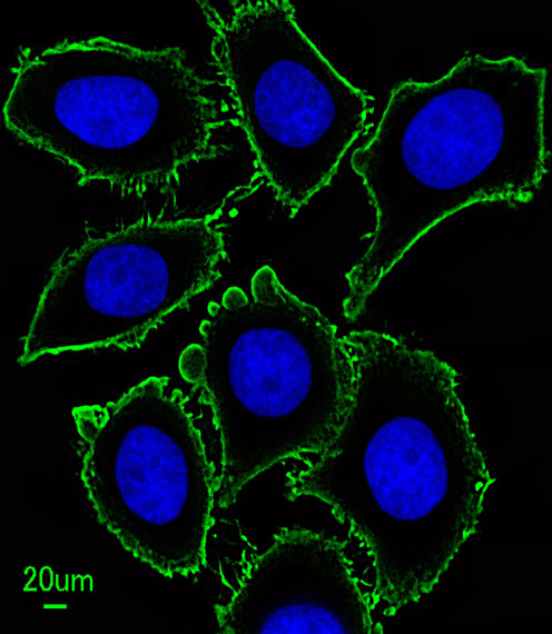 Immunofluorescent analysis of U251 cells, using KIT Antibody (Cat. AMM02436G). AMM02436G was diluted at 1:100 dilution. Dylight Fluor 488-conjugated goat anti-mouse lgG at 1:400 dilution was used as the secondary antibody (green). Cytoplasmic actin was counterstained with Dylight Fluor? 554 (red) conjugated Phalloidin (red).