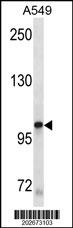 KIT Antibody(Cat. AMM02436G) western blot analysis in A549 cell line lysates (35μg/lane).This demonstrates the KIT antibody detected the KIT protein (arrow).