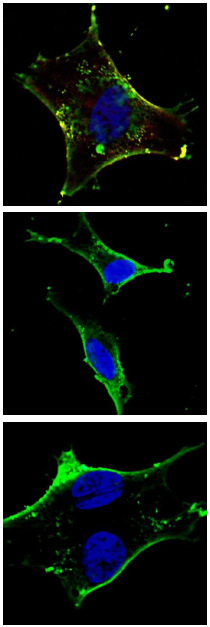 Fluorescent confocal image of an SY5Y (SH-SY5Y) cell stained with AMM02436G KIT antibody. SY5Y cells were fixed with 4% PFA (20 min), permeabilized with Triton X-100 (0.2%, 30 min), then incubated with AMM02436G KIT primary antibody (1:500, 2 h at room temperature). For secondary antibody, Alexa Fluor? 488 conjugated donkey anti-mouse antibody (green) was used (1:1000, 1h). Cytoplasmic actin was counterstained with Alexa Fluor? 555 (red) conjugated Phalloidin (5.25 μM, 25 min). Nuclei were counterstained with Hoechst 33342 (blue) (10 μg/ml, 3 min). Note the highly specific localization of the KIT immunosignal to the membranes, especially the plasma membrane. ibid. References for SY5Y (SH-SY5Y; ATCCCRL-2266): 1. Ross RA, et al. Coordinate morphological and biochemical interconversion of human neuroblastoma cells. J. Natl. Cancer Inst. 71: 741-749, 1983. [PubMed: 6137586]; 2. Biedler JL, et al. Multiple neurotransmitter synthesis by human neuroblastoma cell lines and clones. Cancer Res. 38: 3751-3757, 1978. [PubMed: 29704]. Ibid. |