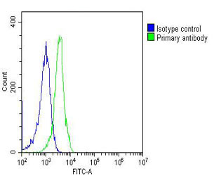 Overlay histogram showing Jurkat cells stained with AM2220B(green line). The cells were fixed with 2% paraformaldehyde (10 min) and then permeabilized with 90% methanol for 10 min. The cells were then icubated in 2% bovine serum albumin to block non-specific protein-protein interactions followed by the antibody (AM2220B, 1:25 dilution) for 60 min at 37?C. The secondary antibody used was Goat-Anti-Mouse IgG, DyLight? 488 Conjugated Highly Cross-Adsorbed(OJ192088) at 1/200 dilution for 40 min at 37?C. Isotype control antibody (blue line) was mouse IgG1 (1μg/1x10^6 cells) used under the same conditions. Acquisition of >10, 000 events was performed.