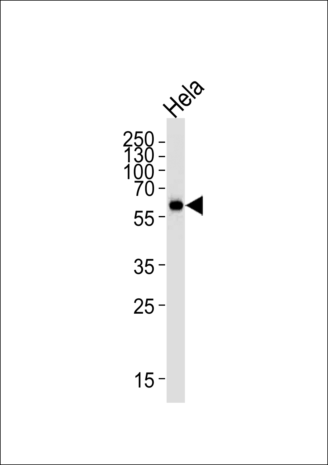 HDAC2 Antibody (Center) (Cat. AMM02478G) western blot analysis in Hela cell lysate (35μg/lane). This demonstrates that the HDAC2 antibody detected HDAC2 protein (arrow). |