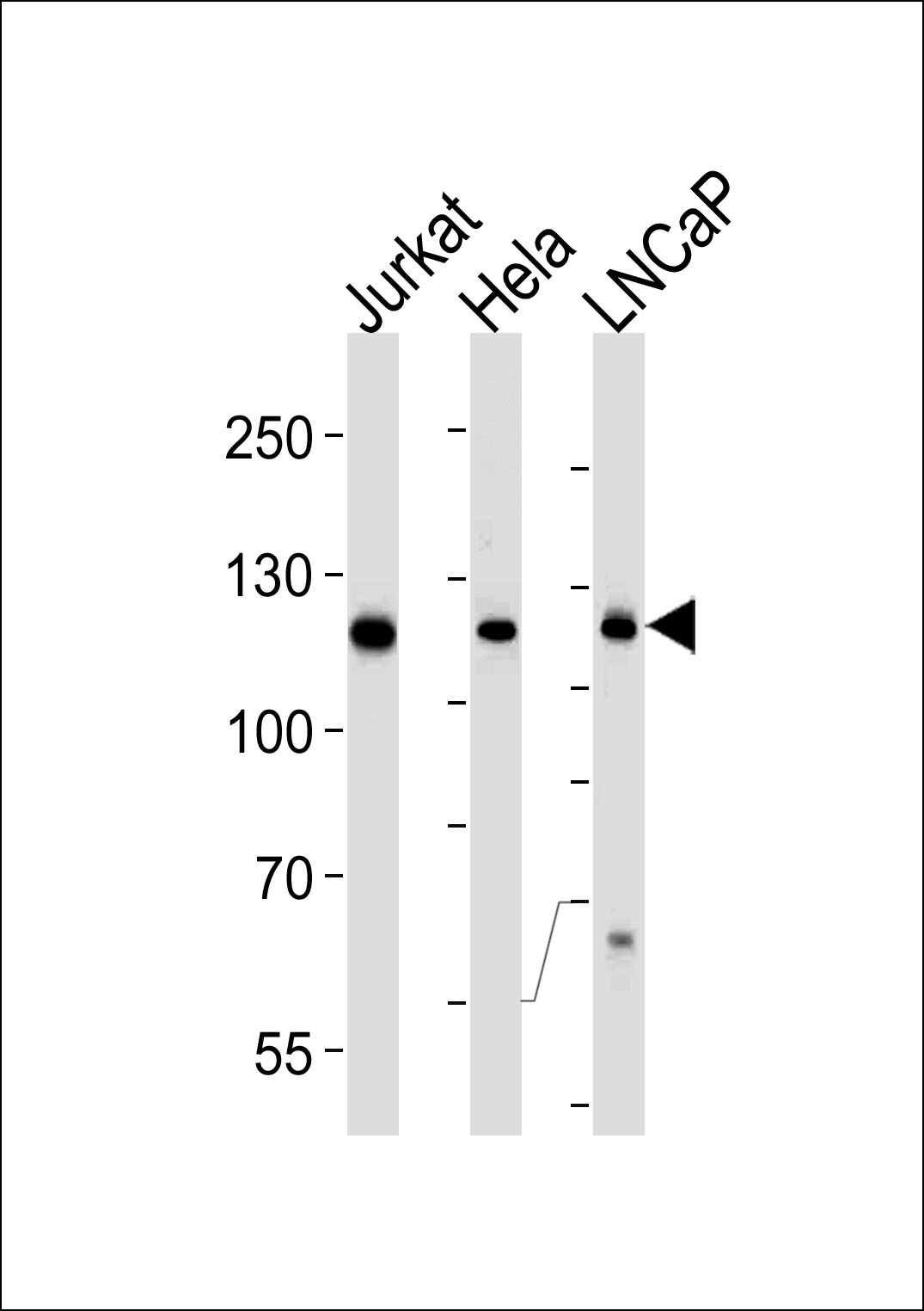 Western blot analysis of lysates from Jurkat, Hela, LNCaP cell line (from left to right) using USP11 Antibody (N-term) ( AMM02484G). AMM02484G was diluted at 1:1000 at each lane. A goat anti-mouse IgG H&L(HRP) at 1:3000 dilution was used as the secondary antibody. Lysates at 35μg per lane. |