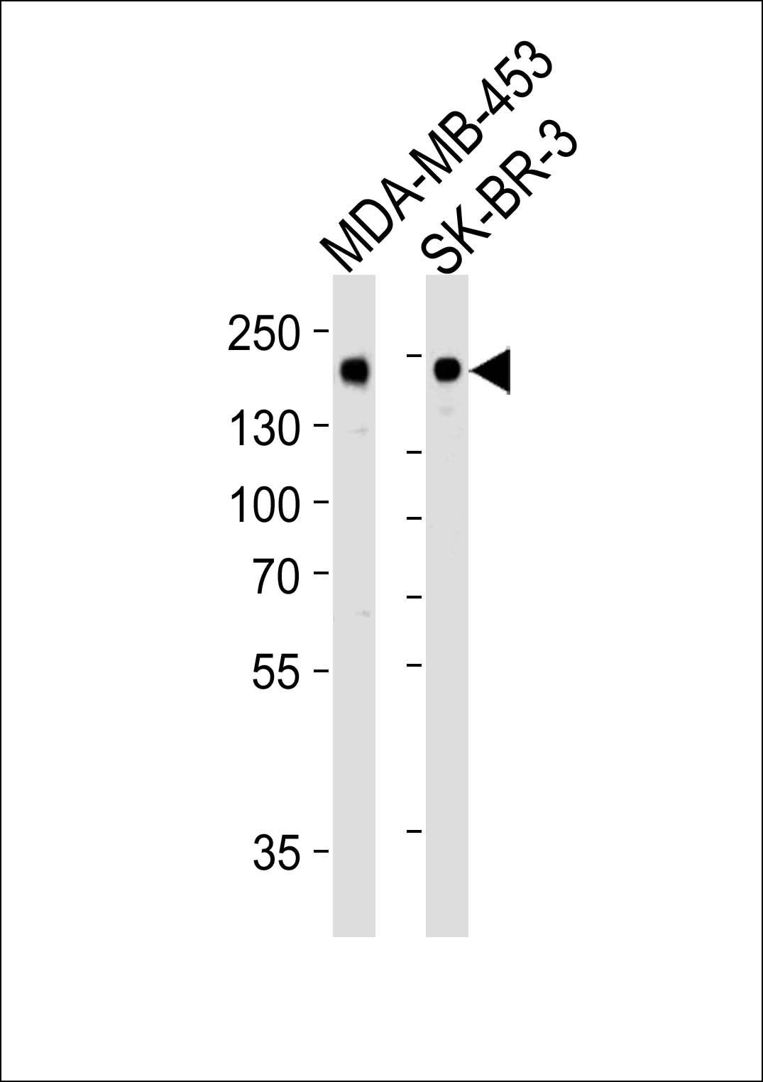Western blot analysis of lysate from MDA-MB-453, SK-BR-3 cell line (from left to right), using ERBB2 Antibody (1423CT594. 76. 52). 1423CT594. 76. 52 was diluted at 1:1000. A goat anti-mouse IgG H&L(HRP) at 1:10000 dilution was used as the secondary antibody. Lysate at 20μg per lane. |