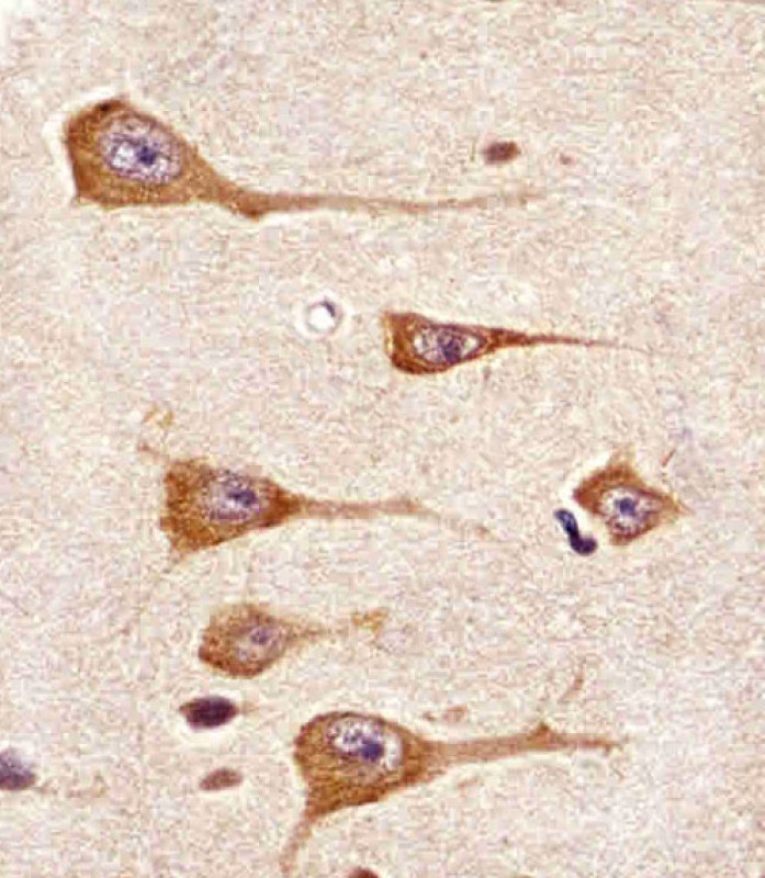AMM02518G staining DDR1 in human brain sections by Immunohistochemistry (IHC-P - paraformaldehyde-fixed, paraffin-embedded sections). Tissue was fixed with formaldehyde and blocked with 3% BSA for 0. 5 hour at room temperature; antigen retrieval was by heat mediation with a citrate buffer (pH6). Samples were incubated with primary antibody (1/25) for 1 hours at 37°C. A undiluted biotinylated goat polyvalent antibody was used as the secondary antibody.