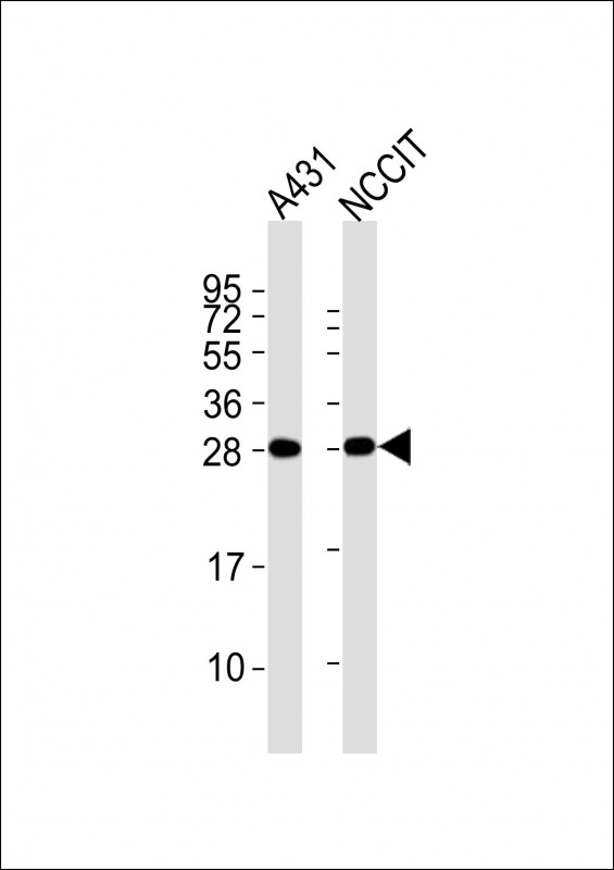 All lanes : Anti-BAP31 Antibody at 1:2000 dilution Lane 1: A431 whole cell lysates Lane 2: NCCIT whole cell lysates Lysates/proteins at 20 μg per lane. Secondary Goat Anti-mouse IgG, (H+L), Peroxidase conjugated at 1/10000 dilution Predicted band size : 28 kDa Blocking/Dilution buffer: 5% NFDM/TBST. |