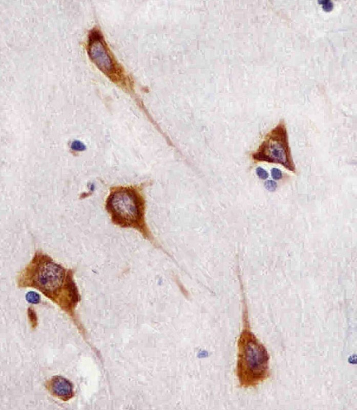 AMM02523G staining FAM120A in human brain sections by Immunohistochemistry (IHC-P - paraformaldehyde-fixed, paraffin-embedded sections). Tissue was fixed with formaldehyde and blocked with 3% BSA for 0. 5 hour at room temperature; antigen retrieval was by heat mediation with a citrate buffer (pH6). Samples were incubated with primary antibody (1/25) for 1 hours at 37°C. A undiluted biotinylated goat polyvalent antibody was used as the secondary antibody.