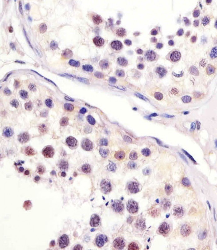 AMM02528G staining MPIP3 in human testis sections by Immunohistochemistry (IHC-P - paraformaldehyde-fixed, paraffin-embedded sections). Tissue was fixed with formaldehyde and blocked with 3% BSA for 0. 5 hour at room temperature; antigen retrieval was by heat mediation with a citrate buffer (pH6). Samples were incubated with primary antibody (1/25) for 1 hours at 37°C. A undiluted biotinylated goat polyvalent antibody was used as the secondary antibody.