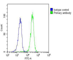 Overlay histogram showing Raji cells stained with AMM02545G(green line). The cells were fixed with 2% paraformaldehyde (10 min) and then permeabilized with 90% methanol for 10 min. The cells were then icubated in 2% bovine serum albumin to block non-specific protein-protein interactions followed by the antibody (AMM02545G, 1:25 dilution) for 60 min at 37?C. The secondary antibody used was Goat-Anti-Mouse IgG, DyLight? 488 Conjugated Highly Cross-Adsorbed(OJ192088) at 1/200 dilution for 40 min at 37?C. Isotype control antibody (blue line) was mouse IgG2a (1μg/1x10^6 cells) used under the same conditions. Acquisition of >10, 000 events was performed.