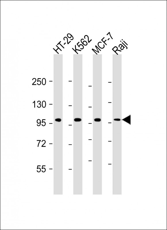 All lanes : Anti-TPX2 Antibody at 1:2000 dilution Lane 1: HT-29 whole cell lysate Lane 2: K562 whole cell lysate Lane 3: MCF-7 whole cell lysate Lane 4: Raji whole cell lysate Lysates/proteins at 20 μg per lane. Secondary Goat Anti-mouse IgG, (H+L), Peroxidase conjugated at 1/10000 dilution. Predicted band size : 86 kDa Blocking/Dilution buffer: 5% NFDM/TBST. |