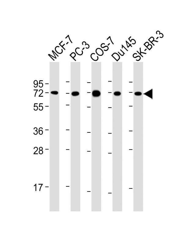 All lanes : Anti-USP2 Antibody at 1:2000 dilution Lane 1: MCF-7 whole cell lysate Lane 2: PC-3 whole cell lysate Lane 3: COS-7 whole cell lysate Lane 4: Du145 whole cell lysate Lane 5: SK-BR-3 whole cell lysate Lysates/proteins at 20 μg per lane. Secondary Goat Anti-mouse IgG, (H+L), Peroxidase conjugated at 1/10000 dilution. Predicted band size : 68 kDa Blocking/Dilution buffer: 5% NFDM/TBST. |