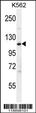 CFH Antibody (Center) (Cat. APR03499G) western blot analysis in K562 cell line lysates (35ug/lane).This demonstrates the CFH antibody detected the CFH protein (arrow).