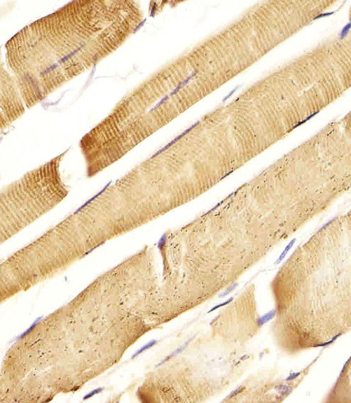 APR03528G staining CD130 in Human skeletal muscle tissue sections by Immunohistochemistry (IHC-P - paraformaldehyde-fixed, paraffin-embedded sections). Tissue was fixed with formaldehyde and blocked with 3% BSA for 0. 5 hour at room temperature; antigen retrieval was by heat mediation with a citrate buffer (pH6). Samples were incubated with primary antibody (1/25) for 1 hours at 37°C. A undiluted biotinylated goat polyvalent antibody was used as the secondary antibody. |