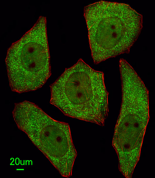 Immunofluorescent analysis of U251 cells, using LRRC45 Antibody (C-term) (Cat. APR03558G). APR03558G was diluted at 1:25 dilution. Alexa Fluor 488-conjugated goat anti-rabbit lgG at 1:400 dilution was used as the secondary antibody (green). Cytoplasmic actin was counterstained with Dylight Fluor? 554 (red) conjugated Phalloidin (red).