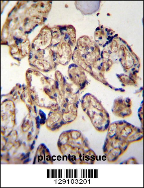 LRRC45 Antibody (C-term) (Cat. APR03558G)immunohistochemistry analysis in formalin fixed and paraffin embedded human placenta tissue followed by peroxidase conjugation of the secondary antibody and DAB staining.This data demonstrates the use of LRRC45 Antibody (C-term) for immunohistochemistry. Clinical relevance has not been evaluated. |