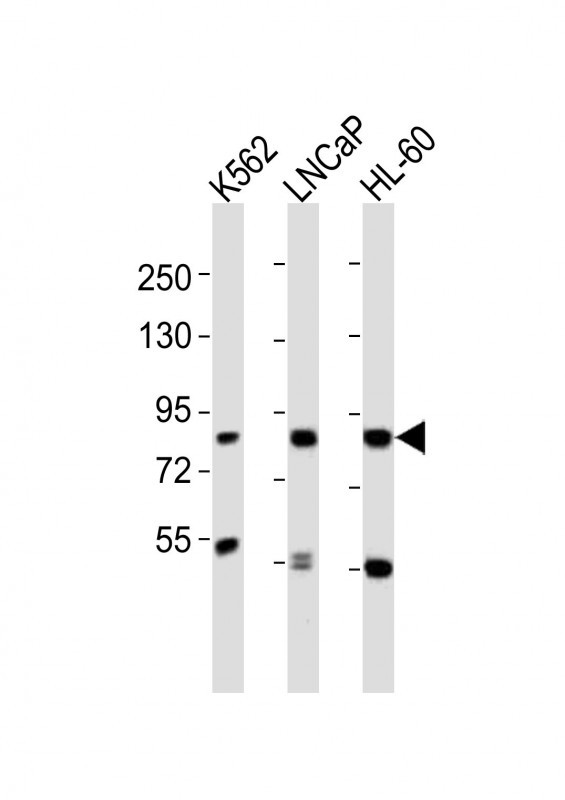 All lanes : Anti-HMMR Antibody (C-term) at 1:2000 dilution Lane 1: K562 whole cell lysates Lane 2: LNCaP whole cell lysates Lane 3: HL-60 whole cell lysates Lysates/proteins at 20 μg per lane. Secondary Goat Anti-Rabbit IgG, (H+L), Peroxidase conjugated at 1/10000 dilution Predicted band size : 84 kDa Blocking/Dilution buffer: 5% NFDM/TBST.