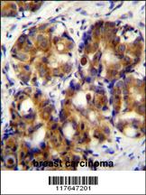 HMMR Antibody (C-term) (Cat. APR03616G)immunohistochemistry analysis in formalin fixed and paraffin embedded human breast carcinoma followed by peroxidase conjugation of the secondary antibody and DAB staining.This data demonstrates the use of HMMR Antibody (C-term) for immunohistochemistry. Clinical relevance has not been evaluated. |
