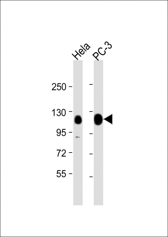 All lanes : Anti-TRIM28 Antibody (N-term) at 1:1000 dilution Lane 1: Hela whole cell lysate Lane 2: PC-3 whole cell lysate Lysates/proteins at 20 μg per lane. Secondary Goat Anti-Rabbit IgG, (H+L), Peroxidase conjugated at 1/10000 dilution. Predicted band size : 89 kDa Blocking/Dilution buffer: 5% NFDM/TBST.
