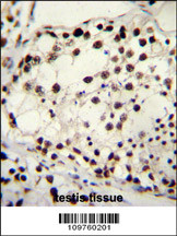 TRIM28 Antibody (N-term) (Cat. APR03626G)immunohistochemistry analysis in formalin fixed and paraffin embedded human testis tissue followed by peroxidase conjugation of the secondary antibody and DAB staining.This data demonstrates the use of TRIM28 Antibody (N-term) for immunohistochemistry. Clinical relevance has not been evaluated. |
