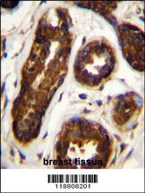 Maspin Antibody (Center) (Cat. APR03653G)immunohistochemistry analysis in formalin fixed and paraffin embedded human breast tissue followed by peroxidase conjugation of the secondary antibody and DAB staining.This data demonstrates the use of Maspin Antibody (Center) for immunohistochemistry. Clinical relevance has not been evaluated.