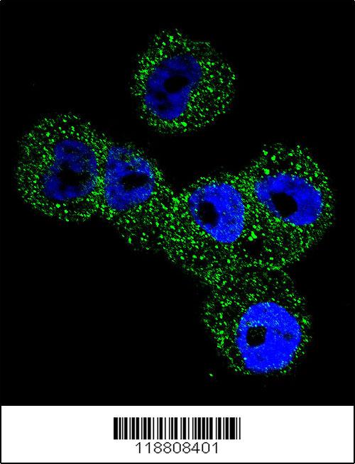 Confocal immunofluorescent analysis of Maspin Antibody (Center)( APR03653G) with A2058 cell followed by Alexa Fluor 488-conjugated goat anti-rabbit lgG (green). DAPI was used to stain the cell nuclear (blue). |